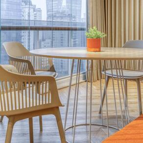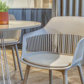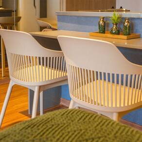 A cadeira Montreal possui assento em polipropileno, com estofado em couro ecológico. Seu encosto, levemente curvado e vazado, traz leveza ao ambiente. Ideal para compor espaços com estilo urbano, que está em alta na decoração!