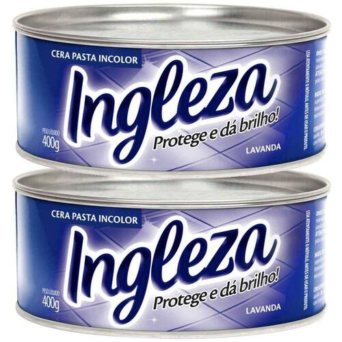 Kit com 2 ceras em pasta ingleza 400g incolor Kit com 2 ceras ingleza em pasta incolor 400g cada Cera pasta ingleza, a tradicional cera em pasta para proteção com rápida secagem e brilho duradouro, após o polimento com enceradeira. ideal também para polimento de móveis rústicos de madeira. Versões- incolor Embalagens- 400 g Ambientes indicados- sala, quarto, sala de jantar Aplicação- assoalhos não sintecados, cerâmicas, mármores, pisos cimentados, móveis, portas e janelas de madeira não impermeabilizada. Atenção- não aplicar em assoalhos sintecados, pisos vinílicos e móveis impermeabilizados. Informações gerais Tradicional cera que protege e dá brilho a assoalhos não sintecados, cerâmicas, mármores, pisos cimentados, móveis, portas e janelas de madeira não impermeabilizada, deixando suave fragrância de lavanda. sua formula hidrata e é ideal para pisos e móveis rústicos. Modo de usar: aplique uniformemente sobre a superfície limpa, com auxílio de um pano, em movimentos circulares. Após secar, lustre com enceradeira e feltro. Para conservar os resultados após alguns dias, retire a poeira com auxílio de um pano úmido, passe a enceradeira com feltro e a superfície voltará a brilhar. Composição - parafina, carnaúba, solvente, corante, 1,2 benzotiazolin-3-ona e fragrância.
