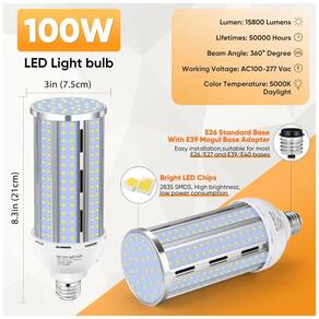 A Lâmpada de Milho LED XYCN oferece qualidade superior, com chips LED de alta qualidade, sistema de controle de calor e design estrutural de resfriamento, resultando em uma vida útil prolongada de mais de 55.000 horas. Com índice de reprodução de cor de 85, as cores são visualizadas com fidelidade. Possui driver LED isolado para garantir estabilidade e longa vida útil. O dissipador de calor de alumínio protegido e design sem ventoinha proporcionam iluminação de 360 graus mais brilhante. Com 100W de potência, oferece incríveis 15.800 lumens, equivalente a uma pequena estrela. Ideal para diversos ambientes como armazéns, garagens, pátios, supermercados, fábricas, estacionamentos, escolas, hospitais, ginásios e iluminação de rua. Fácil instalação e ampla aplicação, sendo um substituto eficiente para lâmpadas incandescentes de 1000W, com economia de energia de 85%. Compatível com voltagem de 100V a 277V. Seguro, eficiente e durável, é a escolha confiável para projetos de iluminação comerciais e industriais.