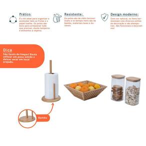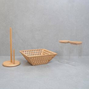 "Conheça o Kit com potes de vidro com tampa de bambu 1,4L, fruteira vazada de bambu, porta papel toalha de bambu de bambu da OIKOS.Resistente, multiuso e com design moderno, é o kit ideal para organizar e acomodar bem temperos, alimentos e seus itens. Os potes, a fruteira vazada, o porta papel toalha são funcionais e decorativos.Os potes são de vidro e bambu e a fruteira e o porta papel toalha são de bambu. Para limpar, basta utilizar um pano úmido e deixar secar em local arejado. Para a parte de vidro dos potes, é só lavar em água corrente com detergente.Leve qualidade e modernidade para sua cozinha!O kit contém:2 Potes de vidro com tampa de bambu quadrados 1,4LFruteira vazada de bambuPorta papel toalha de bambu"