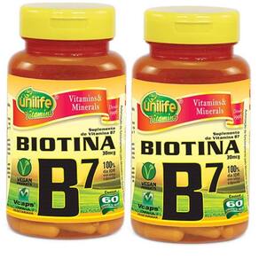 Kit com 2 vitaminas b7 biotina 500mg 60 cápsulas unilife biotina 500mg 60caps - unilife a biotina é uma vitamina essencial para a síntese de novas fibras de colágeno, elastina e queratina. Ela faz parte do complexo de vitamina b. Todas as vitaminas do complexo b não são produzidas pelo corpo. Precisamos adquirí-las através da dieta. Apesar de a vitamina b7 estar presente na maioria dos alimentos, ela é umas das mais ausentes no organismo, devido à sua fragilidade. Benefícios a biotina possui o importante papel no fortalecimento da raiz e dos fios do cabelo, pois estimula o seu crescimento, auxilia na prevenção de dermatites, calvície e no aparecimento de fios brancos, proporcionando maior resistência e vitalidade aos cabelos e unhas. -melhora a energia celular atp - melhora a qualidade da saúde nervosa - ação antioxidante