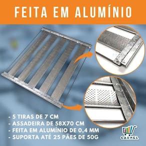 A Assadeira é feita em aço alumínio e possui 5 tiras com capacidade para até 25 pães de 50g. O fundo da assadeira é feito de tela de alumínio perfurada, facilitando o trabalho e a limpeza do produto.