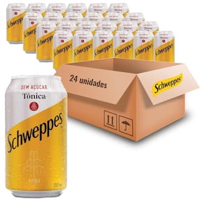 Produto: Kit com 24 unidades de Água Tônica SCHWEPPES Sem Açúcar 350ml. Ingredientes: Água gaseificada, quinino, acidulante ácido cítrico, aroma natural, conservador benzoato de sódio. Marca: SCHWEPPES. Origem: Brasil. Conservação: Armazenar em local fresco e seco. Após aberto, consumir imediatamente. Validade: Consultar embalagem.