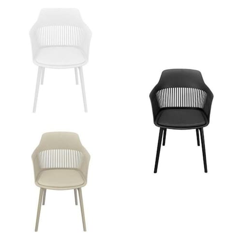 Cadeira com assento e encosto em polipropileno injetado, que é um tipo de plástico resistente, leve e de fácil manutenção. O polipropileno injetado é amplamente utilizado na fabricação de móveis por sua durabilidade e custo-benefício.
