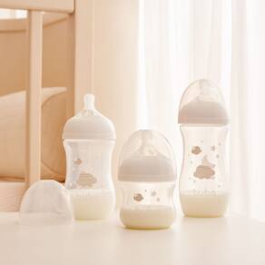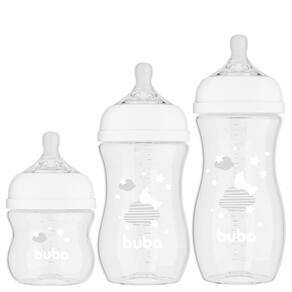 O kit inclui 3 mamadeiras com capacidade de 120ml, 270ml e 330ml e bicos fluxo tamanhos 1,2 e 3.