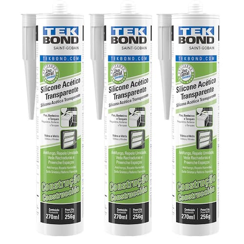 CARACTERÍSTICAS TÉCNICAS: Material: Silicone acético Conteúdo: 256g Cor: Transparente Densidade a 25 C (g/mL): 0,93 à 1,05 Tempo de formação de película: 5 à 15 minutos Temperatura ideal de aplicação: + 5 à 35C Temperatura de trabalho: - 50 à 150C Alongamento à ruptura: =800 % Dureza Shore A: 25 Cura gradativa a 23°C e 55% U.R. após 24 horas: =3 mm Quantidade: 3 unidades Marca: Tekbond Ref.: 3683702
