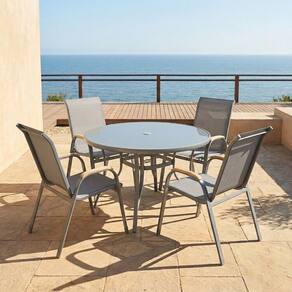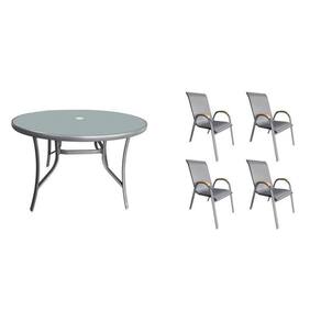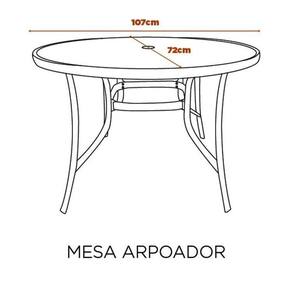 1x Mesa em Alumínio e Tampo em Vidro Temperado com Furo para Ombrelone Arpoador Cinza Largura: 107 cm Altura: 72 cm Peso: 16,56 kg Profundidade: 107 cm Necessita Montagem: Sim