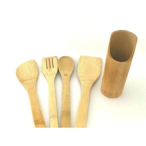 Kit com 4 talheres de bambu com suporte, sendo 1 Colher, 1 Garfo, 1 Espátula, 1 Espátula Pão Duro e Suporte.