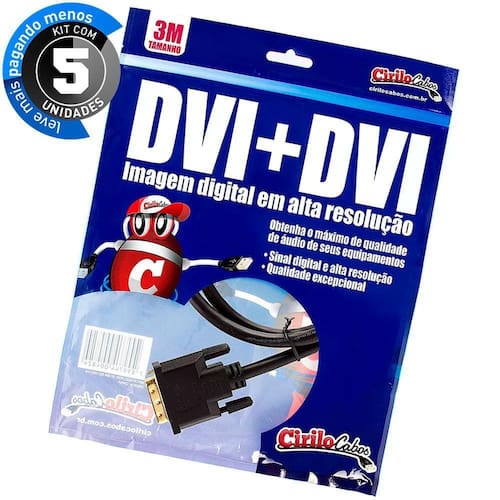 Kit Com 5 Cabos Dvi Para Dvi, 3 Metros - Cirilo Cabos Ideal para conectar sua placa de vídeo ou qualquer outro produto com entrada DVI de 25 pinos diretamente no monitor ou retroprojetor. Esse cabo conta com pontas DVI macho, além de banhadas em ouro, garantindo maior velocidade na transmissão de imagem. O Cabo DVI-D para DVI-D Dual Link de 3 metros da Cirilo Cabos é compatível com dispositivos de interface de entrada de vídeo DVI-D como: Monitores LCD, TVs LCD, Plasma, além de projetores digitais. - Imagem em alta resolução Digital HD - Conectores Banhados em Ouro - DVD-D 25 Pinos Dual Link - Resistente Especificações Técnicas: Conectores: - DVI-D para DVI-D - Macho - 25 Pinos - Parafusos laterais para melhor fixação Resolução: Pontas: Banhadas em Ouro Comprimento do cabo: 3 metros Cor: Preto Acompanha: 05 - Cabos DVI-D para DVI-D Dual Link - 3 metros - Cirilo Cabos Peso Individual: 185g Peso do Kit: 925g Garantia: 3 meses Atenção: Cabo DVI para DVI não transmite áudio. Verifique a compatibilidade com seu equipamento antes da compra, não nos responsabilizamos por incompatibilidades.
