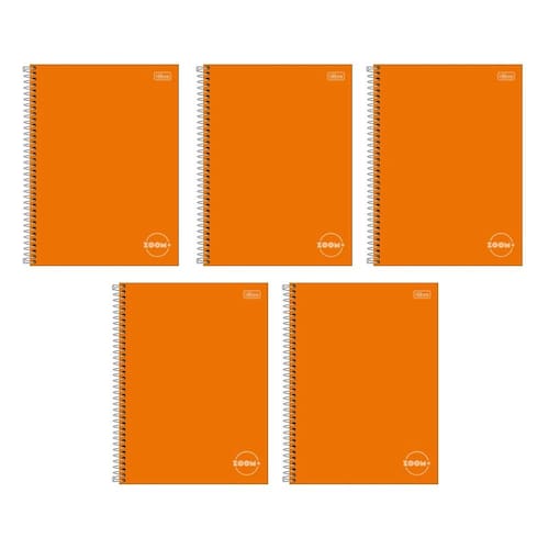 - Kit com 5 cadernos de capa dura na cor laranja - Cada caderno possui 96 folhas pautadas - Formato espiral que proporciona praticidade - Papel de qualidade para escrita suave - Design exclusivo e moderno da linha Zoom Tilibra