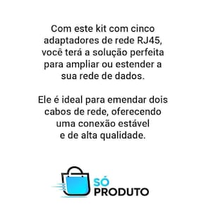 Com este kit com cinco adaptadores de rede RJ45, você terá a solução perfeita para ampliar ou estender a sua rede de dados. Ele é ideal para emendar dois cabos de rede, oferecendo uma conexão estável e de alta qualidade. Além disso, ele vem com cinco unidades, para que você possa usá-lo várias vezes. O design ergonômico do adaptador permite uma conexão fácil e segura, sem a necessidade de ferramentas especiais. Tudo o que você precisa fazer é conectar os cabos de rede nas entradas do adaptador, e em questão de segundos, a conexão será estabelecida. Além disso, a robustez do design garante que a conexão não será perdida ou interrompida, mantendo-a estável ao longo do tempo.
