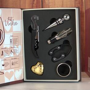A escolha de um vinho deve sempre ser baseada na ocasião em que será servido, festa, reunião, jantar... Cada ocasião pede um vinho diferente, mas todas combinam com amor e acessórios!É o presente perfeito para quem irá compartilhar com você este momento.Estojo em MDF formato livro com pintura temática, perfeita para completar sua coleção e agregar na decoração do ambiente.Especificações do produto:Material do Estojo: MDFMaterial dos acessórios: Metal.Dimensões do produto:Altura: 21cmLargura: 4cmComprimento: 16,5cmItens Inclusos:- Estojo decorado- Saca Rolhas.- Tampa para Garrafa.- Oxigenador.- Corta Lacre.- Anel Salva Gotas.- Enfeite Coração.