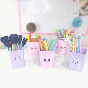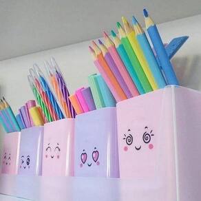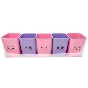 Kit acompanha suporte em PP com furos para fixação, 5 porta objetos e cartela de adesivos com 12 carinhas. Em tons pastel. Linha Serena.