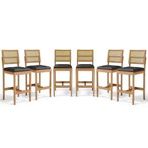 Kit Com 6 Banqueta Milena Madeira Maciça Assento Estofado Encosto De Tela Palha Sextavada Courino Preto 503 - Banquetas Banquinhos Em Madeira Maciça Encosto De Tela Palha Sextavada