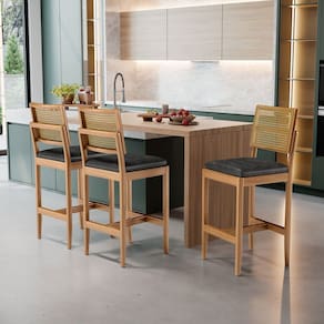 Apresentamos a você as banquetas Milena, estruturadas em madeira maciça com tela palha sextavada nos encostos, assentos estofados com espuma D-23.