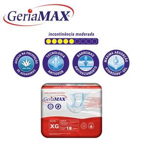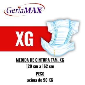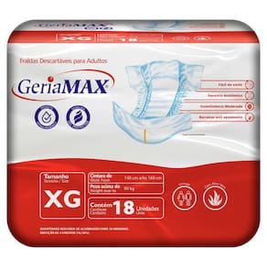 Fácil e vestir Formato Anatômico Barreira anti vazamento Aloe vera Contém: 1 pacote de Fraldas Adulto com 18 unidades Marca: Geriamax Tamanho: XG Indicação: a partir de 90Kg - cintura com até 120 á 162cm Quantidade: 18 unidades Gênero: Unissex