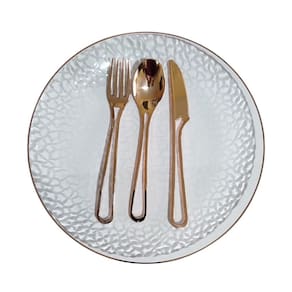 Kit Com 6 Pratos Acrílico E 18 Talheres Rosê Para Natal Festa Contém: 6 unidades Pratos Refeição Redondo Transparente Acrílico Borda Rosê 25,3cm 6 unidades Garfo Rosê 18cm 6 unidades Faca Rosê 19cm 6 unidades Colher Rosê 18cm