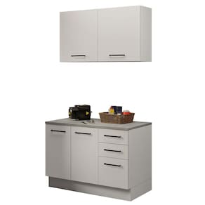 O balcão deste kit apresenta duas portas com fechamento suave e puxadores em alumínio e três gavetas espaçosas com corrediças telescópicas, de abertura total.