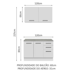 - Um (1) Balcão de 120 cm de largura com duas (2) portas, três (3) gavetas e tampo