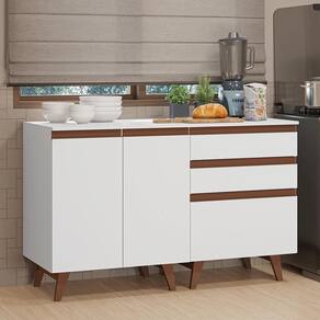 Com visual marcante e toque retrô, a linha Reims se destaca pelos pés em madeira maciça no estilo palito, inspirados no design dos anos 1960. Os detalhes reforçam a sofisticação: puxadores em metal, corrediças e dobradiças metálicas, além do tampo removível ideal para quem deseja instalar pedra ou cooktop e personalizar conforme sua necessidade.