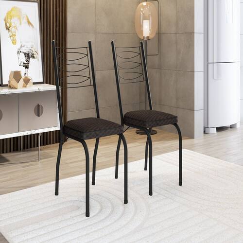 Que tal o Conjunto com 2 Cadeiras 262 linha Europa ?Nada como ter os móveis certos para cada ambiente, não é mesmo? Sua sala de jantar ou cozinha vai ficar ainda mais linda com o Conjunto com 2 Cadeiras 262 Preto! Ideal para acomodar os amigos de forma confortável garantindo reuniões agradáveis ao redor da mesa, elas possuem um design clássico e oferecem diversas possibilidades na hora de decorar o espaço. Ambiente Principal: Cozinha codigo_ean: 7900288125804 Complexidade da Montagem: Baixa: pode ser montado por uma pessoa sozinha Cor: Preto/Cacau Cor do Produto: Preto/Cacau Dobrável: Não Enchimento do Assento: Espuma D-25 Escala de Brilho: Semi-Fosco Estrutura do Assento: MDP Giratória: Não Informações Complementares: Revestimento Corvin cor Tecelão Cacau Itens Inclusos: 2 Cadeiras, Acessorios e Manual de Montagem Manual de Montagem e Instalação: https://product-hub-prd.madeiramadeira.com.br/504520691/documents/391f1189-35a7-4af4-b91b-6d8d1e37783f2865636527317449854330676.pdf Marca: Artefamol Material Principal: Aço Carbono Necessita Montagem: Sim Origem do Produto: Nacional Peso: 3,18 kg Possui Apoio para Braços: Não Possui Apoio Para os Pés: Não Possui Assento/Encosto Estofados: Possui Somente o Assento Estofado Possui Rodízio: Não Recomendações de Uso, Manutenção e Limpeza: Limpar com pano levemente umedecido com água Sistema de Montagem: Parafusos