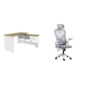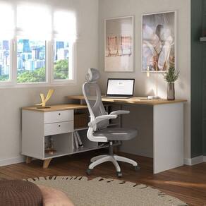 A Office Columbus, possui dispositivos para regulagem de altura, apoio de cabeça ajustável, braços rebatíveis e sistema relax, os rodízios são em Nylon, revestimento do encosto e assento em tela mesh. Com design arrojado, possui a beleza perfeita para ambientes funcionais. Acabamento: BP Altura do Conjunto: 120 cm Ambiente: null Ambiente Principal: Escritório Cor: Gold Branco/Olmo Informação Complementar: 1x Escrivaninha Retrô em L para Escritório e Home Office com 2 Gavetas e 5 Nichos Gold Branca/Olmo Largura: 145 cm Altura: 75 cm Peso: 49 kg Profundidade: 60 cm Necessita Montagem: Sim