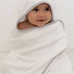 Toalha Power Sec Comfort com Capuz Cinza Produzida em tecido de alta tecnologia, com 85% poliéster e 15% poliamida, a toalha Laço Bebê Comfort possui toque supermacio e poder de absorção até 8 vezes maior do que uma toalha comum. O capuz mantém a cabeça do bebê seca e protegida, garantindo conforto e segurança após o banho. Com modelagem estilo poncho, é prática e envolvente, ideal para o uso desde o nascimento até os 36 meses.