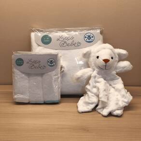 Contém 1 Toalha com Capuz (80 cm x 100 cm) 3 Babitas (30 cm x 25 cm cada) 1 Naninha Ovelha (30 cm x 30 cm)
