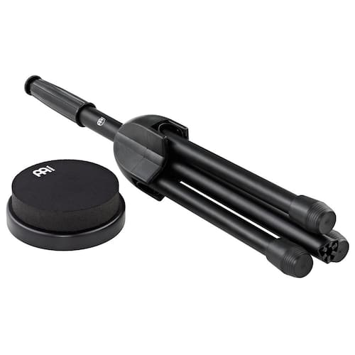 Inclui um pad Marshmallow de 4" para prática quase silenciosa e com menor retorno, acompanhado do suporte para pad de prática MEINL Cymbals. Esse suporte é facilmente dobrável e tem ajuste de altura. Altura máxima: 94 cm; altura mínima: 48 cm. As pernas dobráveis ocupam pouco espaço, e os pés com acabamento em borracha evitam deslizamentos ou danos em pisos sensíveis. O pad é conectado ao suporte por meio de uma haste roscada de 8 mm.