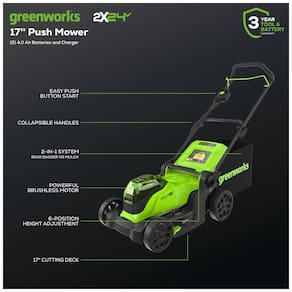 Especificações: Fonte de Energia: Bateria, Material: Aço Inoxidável, Plástico, Cor: Verde e Preto, Estilo: Potência, Número de Posições: 6, Modo de Operação: Automático, Dimensões do Produto: 104,1cm x 44,5cm x 52cm, UPC: 195526120117, Altura de Corte Máxima Ajustável: 10,16 centímetros, Altura de Corte Mínima Ajustável: 3,18 centímetros, Fabricante: Greenworks, Peso do Item: 26,08 kg, Modelo: CK24L4222, Baterias: 2 baterias de Íon de Lítio necessárias (inclusas) Voltagem:110 volts Marca: Não Informado