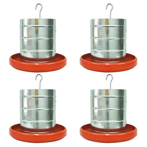 Conhecido como comedouro suspenso, usado por sitiantes em aviários, tubo galvanizado, base prato plástico vermelho. Características: Volume 3kg de ração,Possui regulagem na travessa superior em conjunto com a haste,O prato com 26 x 26 Cm é injetado com material 100% puro virgem PP H 103 com 0,02% "UV" contra raios ultravioletas,Altura Total 19 Cm,Fácil acesso das aves ao alimento,Peso: 583g,Marca: ZattiConteúdo da embalagem: Kit com 4 comedouros com capacidade para 3kg de ração cada.Produto isento de registro Anvisa/Inmetro.