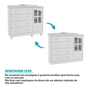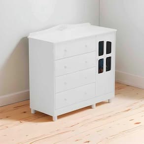 A Cômoda Elô Infantil complementa o kit com espaço de sobra para organização. São 4 gavetas com corrediças telescópicas e 1 porta com detalhe em vidro e cabideiro interno, ideais para roupas, brinquedos e acessórios. O acabamento branco com detalhes em amêndoa agrega charme e versatilidade ao ambiente. Para maior segurança, conta com sistema antitombamento e pés reguláveis em ABS, tornando-se um móvel funcional e resistente para acompanhar a rotina da família.