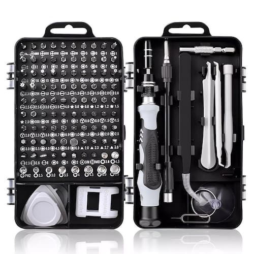 Otimize seus consertos com o Kit de Ferramentas de 115 Peças, ideal para profissionais e entusiastas de bricolagem. Equipado com 100 pontas intercambiáveis, incluindo Phillips, Flat, Torx, Pentalobe, Hex e muito mais, este conjunto oferece a solução perfeita para desmontagem e manutenção de eletrônicos, como smartphones, laptops, consoles de jogos e outros dispositivos delicados.