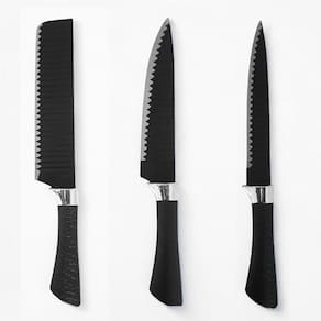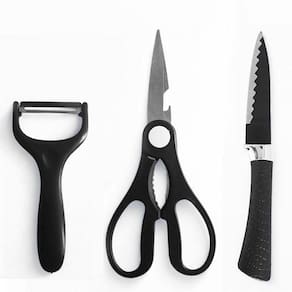 Itens Inclusos: - 1x Faca de Cozinha; - 1x Faca para Fatiar; - 1x Faca de Chef; - 1x Faca de Aparar; - 1x Faca Universal; - 1x Descascador de Legumes; - 1x Tesoura Multiuso.