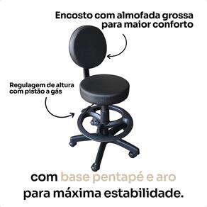 • Cadeira Mocho com Encosto, Base Pentapé, Aro de apoio para os pés e Regulagem de altura por Pistão a Gás: ergonomia e conforto para o profissional, com assento estofado em tecido Facto fácil de limpar, aro para descanso dos pés, base estável e suporte para até 120 kg.