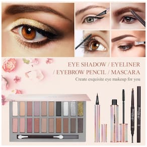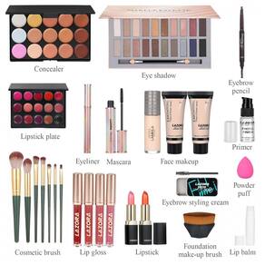 O Kit Completo de Maquiagem Venshun Multiuso integra múltiplos cosméticos e acessórios em embalagem compacta com dimensões de 23,2 x 17,7 x 10,2 cm, otimizado para portabilidade em viagens ou uso diário. Inclui paleta de 20 cores para sombras, corretivo, batom, base, BB cream, loção corporal marrom, máscara para cílios, gloss labial, sombra adicional, bastão contorno, delineador, lápis para sobrancelhas, balm labial, primer para maquiagem, pincéis e estojo cosmético dedicado.