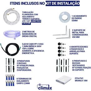 Itens inclusos: 5 metros - Tubo de Cobre flexível 1/4" já Flangeadas 5 metros - Tubo de Cobre flexível 3/8" já Flangeadas 2 porcas de 1/4" em Latão (Colocados na Tubulação) 2 porcas de 3/8" em Latão (Colocados na Tubulação 5 metros - Isolamento Térmico Blindado 1/4" 5 metros - Isolamento Térmico Blindado 3/8" 5,60 metros - Cabo PP Flexível com 4x1,5mm 20 metros - Fita de PVC branca 4 Parafusos Nº 8 Philips para a fixação da evaporadora 4 Buchas Nº 8 FU para a fixação da evaporadora 1 Acabamento de parede Ø 55mm 1 Par suporte 45 cm de metal (Compativel com Condensadora Redonda e Retangular) 4 Parafusos com porcas e arruelas do suporte 4 Amortecedores da unidade condensadora 6 Parafusos Nº 10 Sextavados para a fixação do suporte 6 Buchas nº 10 FU para a fixação do suporte