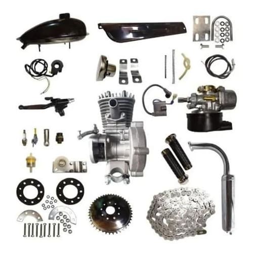 Kit Completo Motor Para Bicicleta Motorizada 100cc prata preto Kit Completo Motor para Bicicleta Motorizada 100CC. Motorize a sua bicicleta e usufrua de um excelente meio de locomoção. Transforme a sua ida ao trabalho, a praia, a padaria ou até mesmo entre os bairros e avenidas, em uma atividade rica e prazerosa. Ideal para a sua mobilidade e para o seu lazer. Se quiser pode também pedalar. Velocidade máxima registrada em torno de 50 km/ hora. O consume depende das condições de uso do produto, variando entre 35 e 50 Km/l Este é um motor 2 tempos portanto uma mistura de gasolina e óleo é necessária. O kit motor é de fácil instalação para quem tem noções de mecânica, se não possuir esse conhecimento procure um profissional para a instalação. Tanque de gasolina 2 litros.É preciso medir na a bike para saber se ela tem as medidas mínimas de 27cm de altura e 17cm de largura entre o quadro. Fabricação importado. Garantia de 03 meses para defeitos de fabricação Limite de peso 120kg Acompanha Manual De instalação Em português. Importante Verifique legislação de trânsito da sua região.