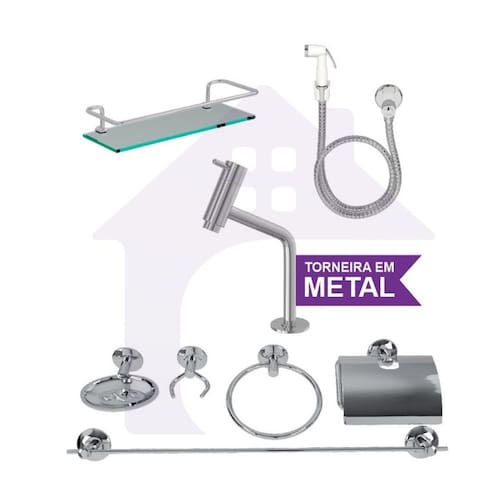 01 porta toalha de banho 47 cm 01 porta toalha de rosto 01 saboneteira 01 papeleira 01 cabide duplo 01 porta shampoo reto prateleiras de vidro 01 ducha higienica cromada metal e abs. 01 torneira