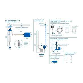 O Kit Completo para Caixa Acoplada é instalado dentro da caixa acoplada e é composto pelo Mecanismo de Entrada, que tem a finalidade de controlar o fluxo de entrada de água para dentro da caixa acoplada; o Mecanismo de Saída que tem a finalidade de controlar o fluxo de água para dentro do vaso sanitário; o Kit Completo para Vedação e Fixação que tem a finalidade de vedar e fixar a caixa acoplada no vaso sanitário e o Acionador que tem a finalidade de acionar todo o sistema. O Kit Completo para Caixa Acoplada é aprovado nos testes de qualidade que asseguram sua vedação, funcionamento e resistência. Adquirir produtos Blukit é certeza de adquirir um produto de qualidade.