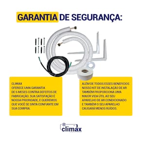 Itens inclusos: 2,5 metros - Tubo de Cobre flexível 1/4" já Flangeadas 2,5 metros - Tubo de Cobre flexível 3/8" já Flangeadas 2 porcas de 1/4" em Latão (Colocados na Tubulação) 2 porcas de 3/8" em Latão (Colocados na Tubulação 2,5 metros - Isolamento Térmico Blindado 1/4" 2,5 metros - Isolamento Térmico Blindado 3/8" 3,10 metros - Cabo PP Flexível com 4x1,5mm 10 metros - Fita de PVC branca 4 Parafusos Nº 8 Philips para a fixação da evaporadora 4 Buchas Nº 8 FU para a fixação da evaporadora 1 Acabamento de parede Ø 55mm 1 Par suporte 45 cm de metal (Compativel com Condensadora Redonda e Retangular) 4 Parafusos com porcas e arruelas do suporte 4 Amortecedores da unidade condensadora 6 Parafusos Nº 10 Sextavados para a fixação do suporte 6 Buchas nº 10 FU para a fixação do suporte