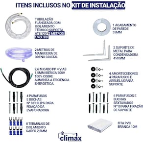 Itens inclusos: 2 metros - Tubo de Cobre flexível 1/4" já Flangeadas 2 metros - Tubo de Cobre flexível 3/8" já Flangeadas 2 porcas de 1/4" em Latão (Colocados na Tubulação) 2 porcas de 3/8" em Latão (Colocados na Tubulação 2 metros - Isolamento Térmico Blindado 1/4" 2 metros - Isolamento Térmico Blindado 3/8" 2,60 metros - Cabo PP Flexível com 4x1,5mm 10 metros - Fita de PVC branca 4 Parafusos Nº 8 Philips para a fixação da evaporadora 4 Buchas Nº 8 FU para a fixação da evaporadora 1 Acabamento de parede Ø 55mm 1 Par suporte 45 cm de metal (Compativel com Condensadora Redonda e Retangular) 4 Parafusos com porcas e arruelas do suporte 4 Amortecedores da unidade condensadora 6 Parafusos Nº 10 Sextavados para a fixação do suporte 6 Buchas nº 10 FU para a fixação do suporte