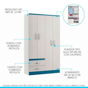 Observa??es: N?o trabalhamos e n?o nos responsabilizamos pela montagem do m?vel. Antes da montagem conferir se o produto est? de acordo com o que comprou, produto montado e danificado pela montagem n?o ser? aceito troca. As imagens ambientadas s?o meramente ilustrativas e podem apresentar itens que n?o comp?e o produto. As cores do produto podem variar de acordo com o monitor, a ilumina??o do ambiente ou sua percep??o visual. Limpeza: Deve ser feita com pano macio e seco ou levemente umedecido com ?gua e sab?o neutro. N?o devem ser utilizados abrasivos como palha de a?o e objetos cortantes. Poss?vel montar todo branco ou branco e azul. Marca: Menu Móveis