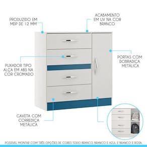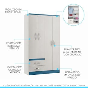 Você merece o melhor quando se trata de móveis para sua casa e a escolha certa para atender todas as suas necessidades. Com um design atual, une versatilidade, conforto e beleza. Com o Kit de Guarda-Roupa e Cômoda, você terá muito espaço para manter tudo organizado. Dispõe da montagem , possibilitando escolher qual cor combina mais com o seu ambiente, toda branca, branca e azul ou branca e rosa. Produzida com materiais de excelente qualidade, garantindo a sua resistência ao desgaste diário e mantendo sua beleza e funcionalidade por muito tempo. O melhor em móveis no design atual aliando conforto, qualidade e ótimos preços, só na Menu Móveis!
