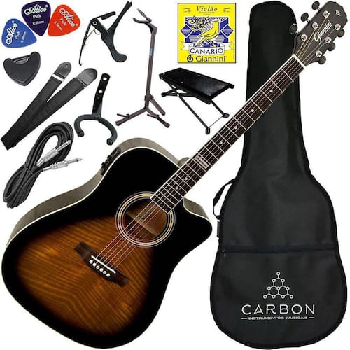 Kit completo violão folk eletroacústico giannini gf1d 3ts A série performance traz uma ampla variedade de modelos de violões aço e náilon, com formatos como o dreadnought, gran auditorium, mini-jumbo e flat. A versatilidade da série performance a torna uma das nossas séries mais vendidas e aclamadas pelo público. - pré-amplificador com equalizador e afinador já instalado no violão - tarraxas blindadas já instaladas no violão para maior durabilidade e estabilidade da afinação Especificações : Modelo: violão folk cutaway eletroacústico aço Série: performance Nº de cordas: 6 cordas Tampo: spruce Faixa e fundo: linden com filete cor marfim na faixa Braço: nato Escala: rosewood Trastes: 20 em alpaca Tarraxas: blindadas cromadas com head preto Captador: rastilho Equalizador: 3 bandas - pré-amplificador ativo com afinador cromático Controles: volume, bass, middle, treble, chave phase e tuner Saída: p-10 Acabamento: verniz brilhante Fabricação: china Dimensões do violão : - comprimento: 105 cm - largura em sua maior largura do corpo : 39,5 cm - profundidade: 11,5 cm - largura da pestana nut : 4,4 cm Itens inclusos : - violão eletroacústico gf1d giannini - capa bag violão - palhetas - correia - cabo p10 / p10 - suporte de parede - encordoamento - capotraste - porta palhetas - suporte apv-05 saty - suporte g3s ask - certificado