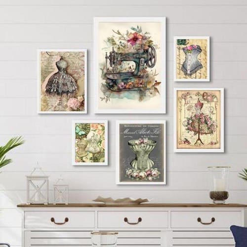Kit composição 6 quadros atelier costura - com vidro Moldura: madeira branca Informações do produto tire todas as suas dúvidas no descritivo abaixo: decoração para quarto, sala, cozinha, escritório, área gourmet e muito mais. Chega de paredes vazias medidas - kit composto por 6 quadros, sendo 2 quadros com medida 18x24cm, 3 quadros com 24x33cm e 1 quadro com medida 33x45cm. Material do papel - papel fotográfico brilhante de altíssima resolução acabamento - todos os quadros são acompanhados de vidro para proteção da imagem. - moldura em madeira maciça na cor preta ou branca conforme produto escolhido e pendurador . - os quadros são embalados de forma segura com plástico bolha com camada dupla de acordo com o tamanho dos quadros. Garantia - garantia de 3 meses. Meu quadro chegou. Como posso fixá-lo Você precisa apenas de um martelo e um prego, pois os quadros já vão acompanhados de penduradores. Esta é a forma mais indicada. Como posso limpar meu quadro A limpeza é feita como um móvel comum da sua casa. Apenas um pano seco ou espanador são suficientes para tal