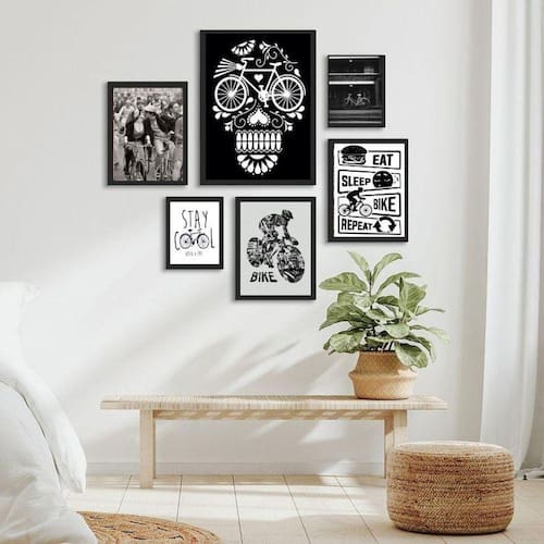Kit composição 6 quadros cantinho da bike Moldura: madeira branca Informações do produto tire todas as suas dúvidas no descritivo abaixo: decoração para quarto, sala, cozinha, escritório, área gourmet e muito mais. Chega de paredes vazias medidas - kit composto por 6 quadros, sendo 2 quadros com medida 18x24cm, 3 quadros com 24x33cm e 1 quadro com medida 33x45cm. Material do papel - papel fotográfico brilhante de altíssima resolução acabamento - todos os quadros são acompanhados de uma película de acetato para proteção da imagem. - os quadros são embalados de forma segura com plástico bolha com camada dupla de acordo com o tamanho dos quadros. Garantia - garantia de 3 meses. Meu quadro chegou. Como posso fixá-lo Você precisa apenas de um martelo e um prego, pois os quadros já vão acompanhados de penduradores. Esta é a forma mais indicada. Caso prefira, você pode utilizar uma fita dupla face neste caso, sugerimos de alta qualidade para evitar que descole e seu quadro caia . Como posso limpar meu quadro A limpeza é feita como um móvel comum da sua casa. Apenas um pano seco ou espanador são suficientes para tal Ean: 7898438891399