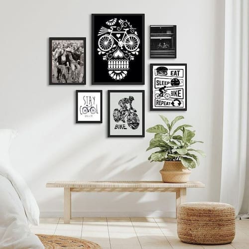 Kit composição 6 quadros cantinho da bike Moldura: madeira preta Informações do produto tire todas as suas dúvidas no descritivo abaixo: decoração para quarto, sala, cozinha, escritório, área gourmet e muito mais. Chega de paredes vazias medidas - kit composto por 6 quadros, sendo 2 quadros com medida 18x24cm, 3 quadros com 24x33cm e 1 quadro com medida 33x45cm. Material do papel - papel fotográfico brilhante de altíssima resolução acabamento - todos os quadros são acompanhados de uma película de acetato para proteção da imagem. - os quadros são embalados de forma segura com plástico bolha com camada dupla de acordo com o tamanho dos quadros. Garantia - garantia de 3 meses. Meu quadro chegou. Como posso fixá-lo Você precisa apenas de um martelo e um prego, pois os quadros já vão acompanhados de penduradores. Esta é a forma mais indicada. Caso prefira, você pode utilizar uma fita dupla face neste caso, sugerimos de alta qualidade para evitar que descole e seu quadro caia . Como posso limpar meu quadro A limpeza é feita como um móvel comum da sua casa. Apenas um pano seco ou espanador são suficientes para tal
