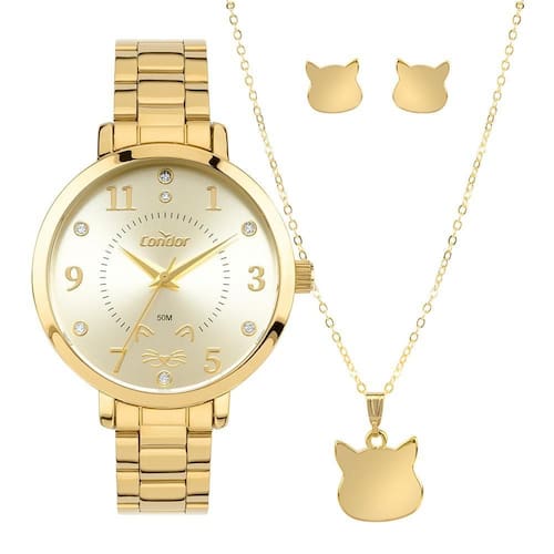 O Kit Condor Feminino Mimos E Sutilezas Dourado combina delicadeza, estilo e personalidade em um conjunto encantador. O relógio possui caixa de 38 mm em metal dourado e pulseira em aço com acabamento polido. Seu mostrador traz um design diferenciado, com detalhe de bigodinho de gato próximo ao marcador de 6 horas, além de marcadores com cristais e algarismos dourados que realçam o fundo champagne.