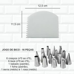 - jogo de bico inox 16 peças: 6 crespos nº0 ao nº5 , 6 lisos nº0 ao nº5 , 1 babado padrão , 1 folha padrão , 1 serra médio e 1 rosa médio